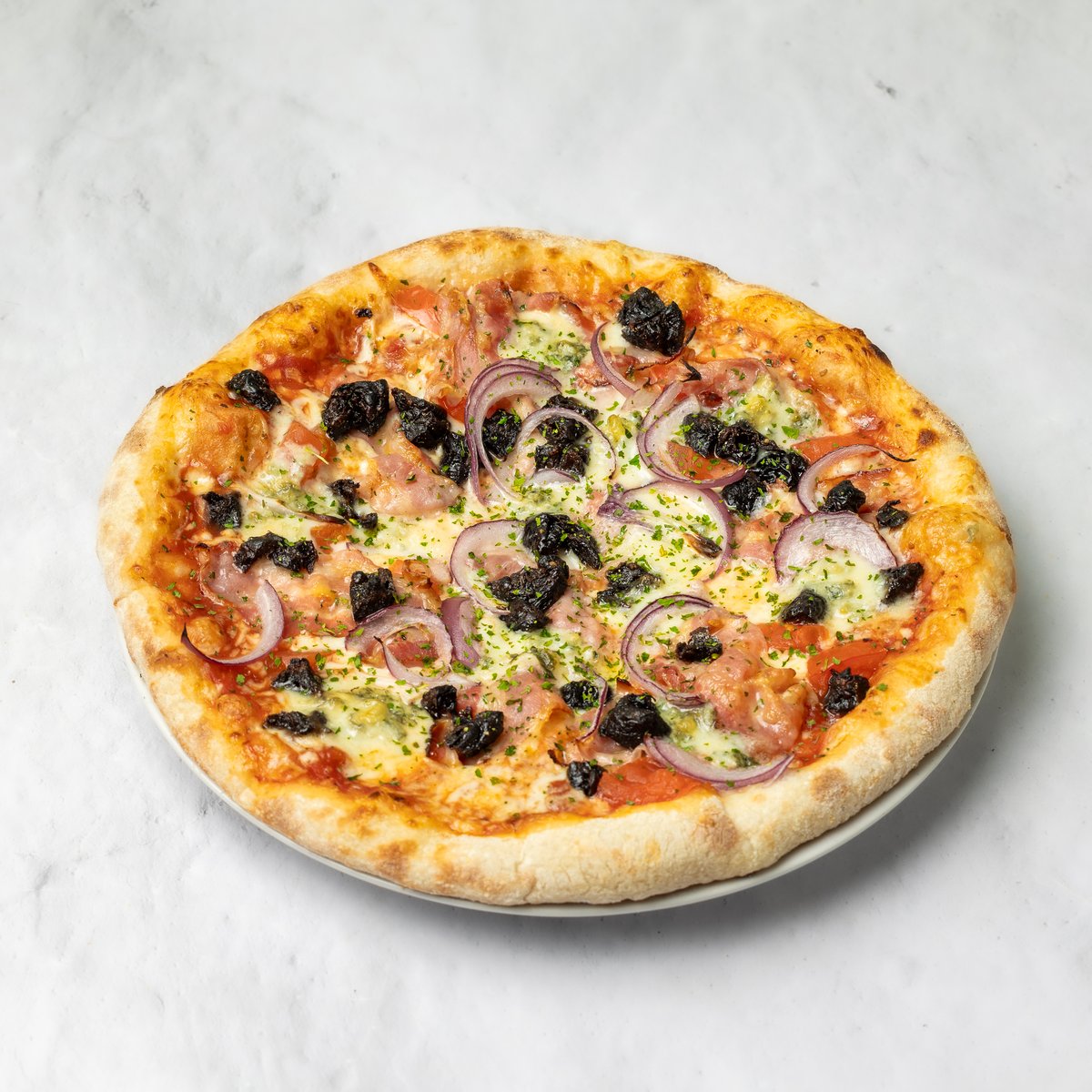 Pelat, kačkavalj, gorgonzola, pančeta, paradajz, suve šljive, crveni luk, peršun