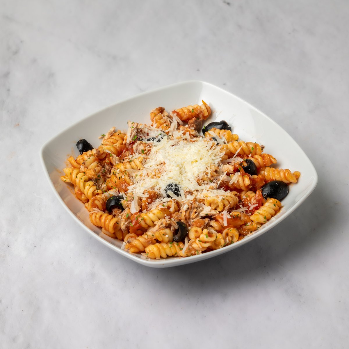 Maslinovo ulje, crni luk, beli luk u ulju, napoli sos, tuna, masline, testenina, parmezan