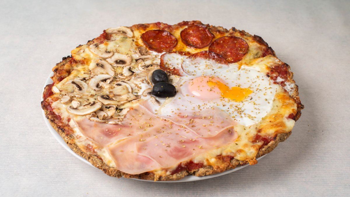 Pelat, kačkavalj, praška šunka, kulen, pečurke, jaje, masline, origano