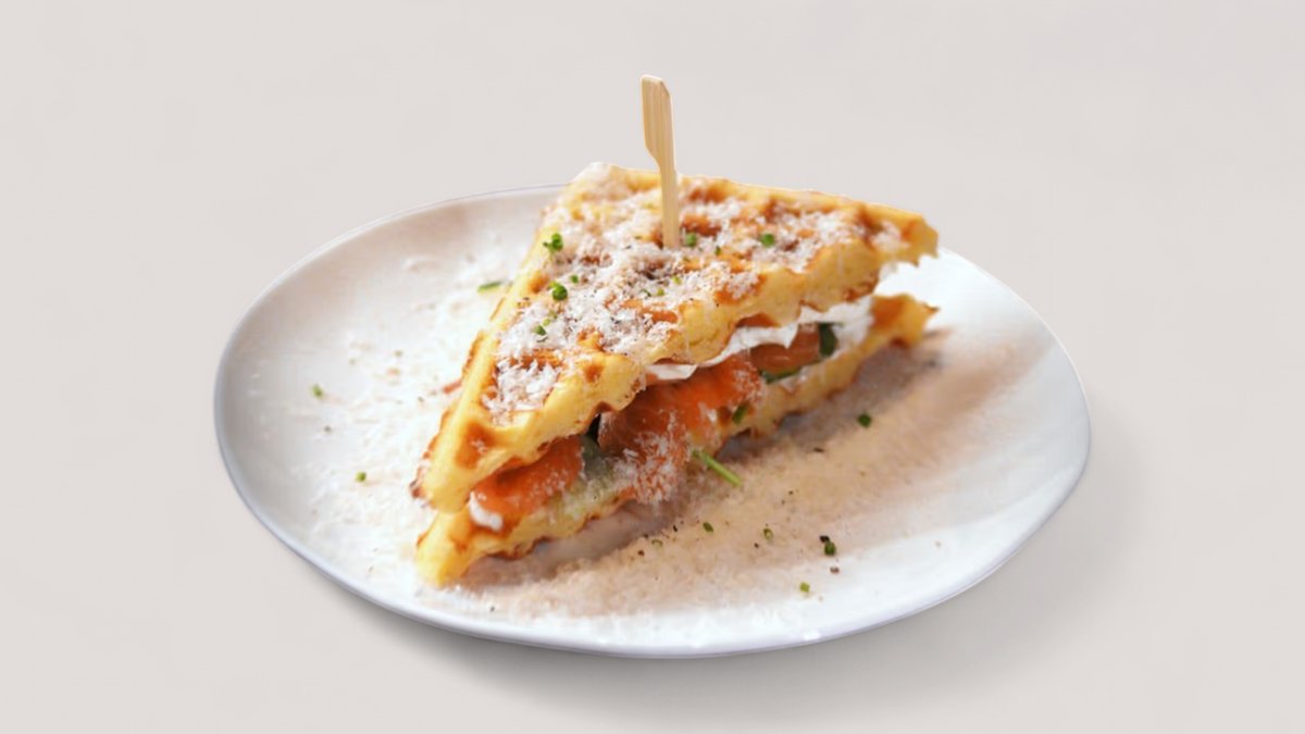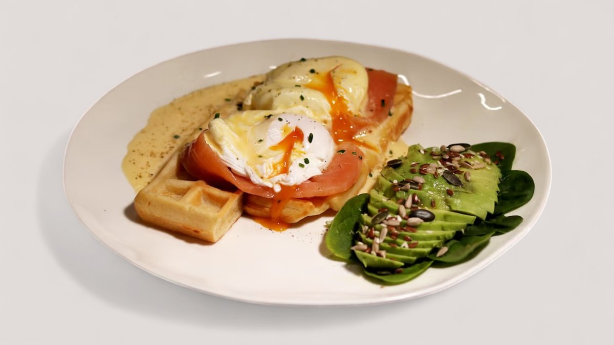 Vazdušasta belgijska vafla, blago hrskava spolja i nežna iznutra, predstavlja savršenu osnovu za prefinjenu kombinaciju ukusa. Na vrhu, tanki listići blago usoljenog lososa dodaju jelu sofisticiranost. Zreli avokado daje kremastu teksturu, dok dva savršeno pripremljena poširana jaja sa tečnim žumancem čine svaki zalogaj zaista primamljivim. Sve to upotpunjuje nežni holandski sos. Kcal: 890 BŽU: 34 / 67 / 43
