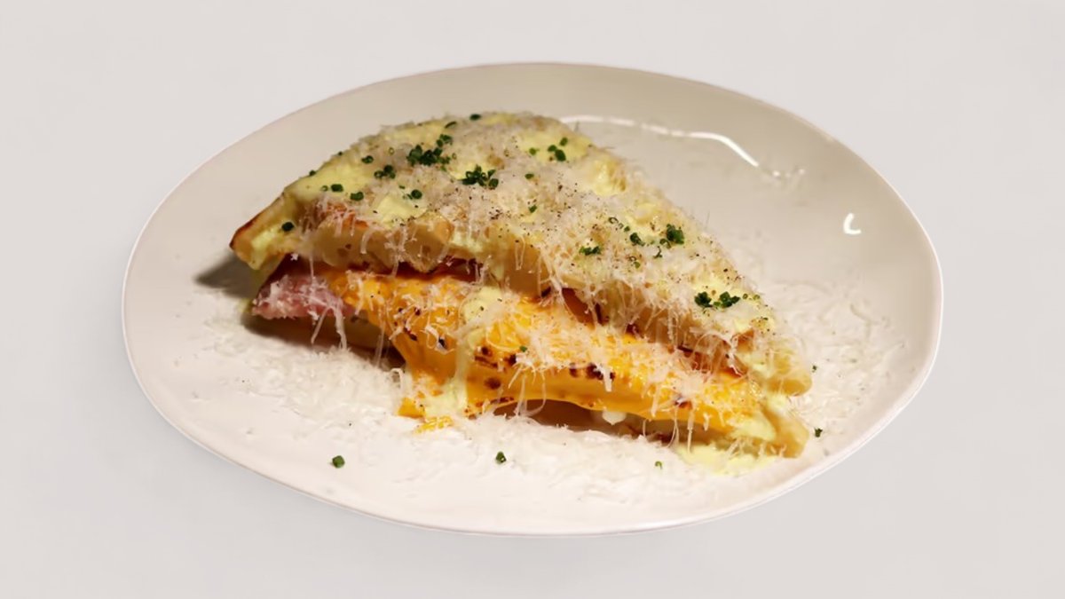 Hrskava vafla punjena sočnom šunkom, toplim čedar sirom i rendanim parmezanom. Blagi sos od belog luka dodaje izražen ukus i čini svaku porciju posebno primamljivom. Kcal: 960 BŽU: 54 / 60 / 105