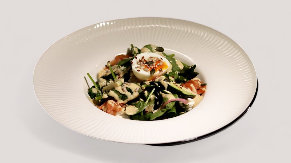 Svež spanać sa parčićima slabo usoljenog lososa, suvim paradajzom i krastavcem, sa aromatičnim orašastim prelivom. Kcal: 295