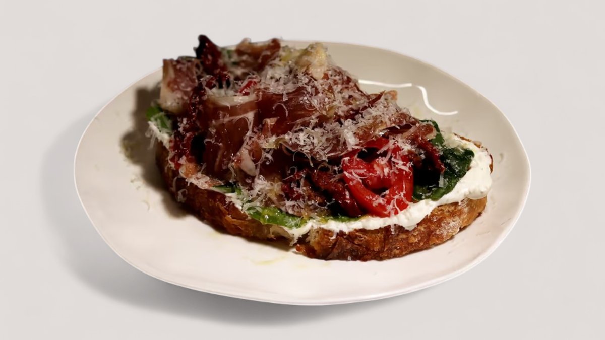 Hrskava brusketa sa pršutom, sušenim paradajzom, trešnjastim paradajzom i parmezanom za klasičan italijanski ukus. Kcal: 560 BŽU: 32 / 36 / 54