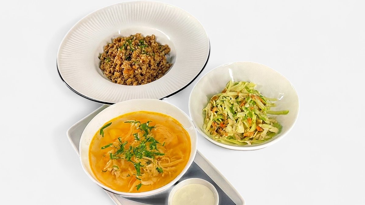 Shchi - cabbage russian soup with sour cream, coleslaw salad, buckwheat with meat and vegetables