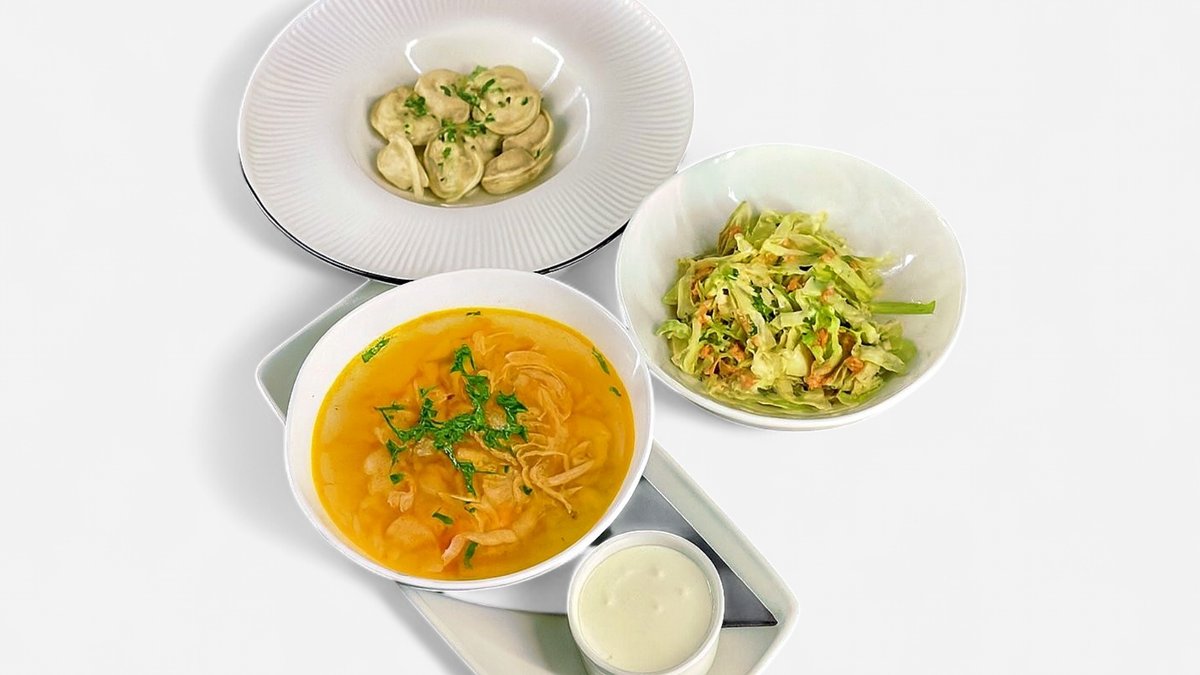 Shchi - cabbage russian soup with sour cream, coleslaw salad, dumplings