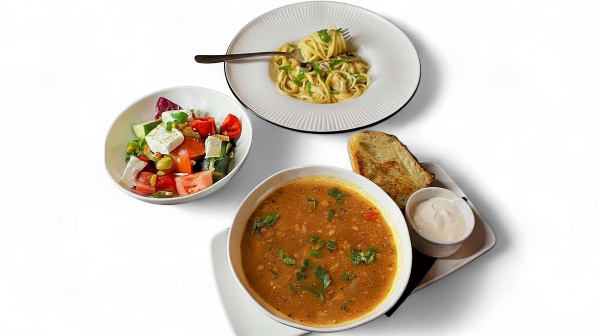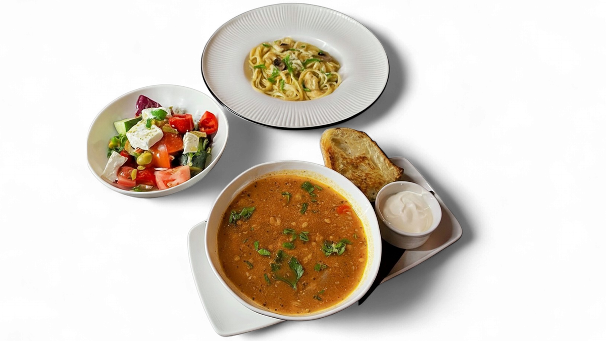 Combo lunch at a great price! Salad, soup, and a main course. Portion size: 800 g. Available at your table on weekdays until 5:00 PM.