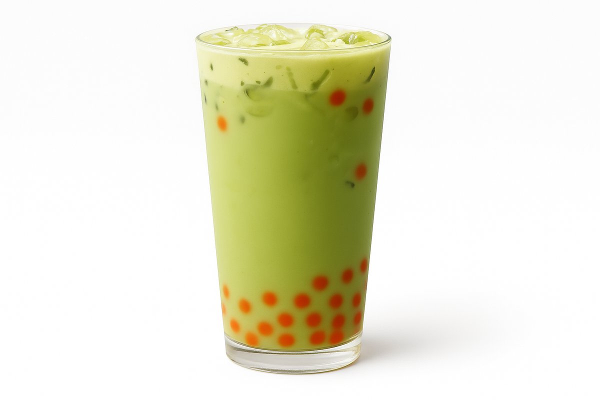 Iced Peach Matcha Latte with Melon Flavour Pearls