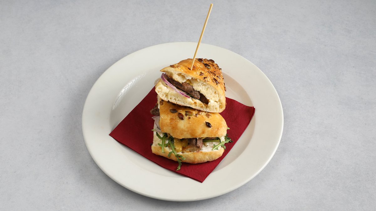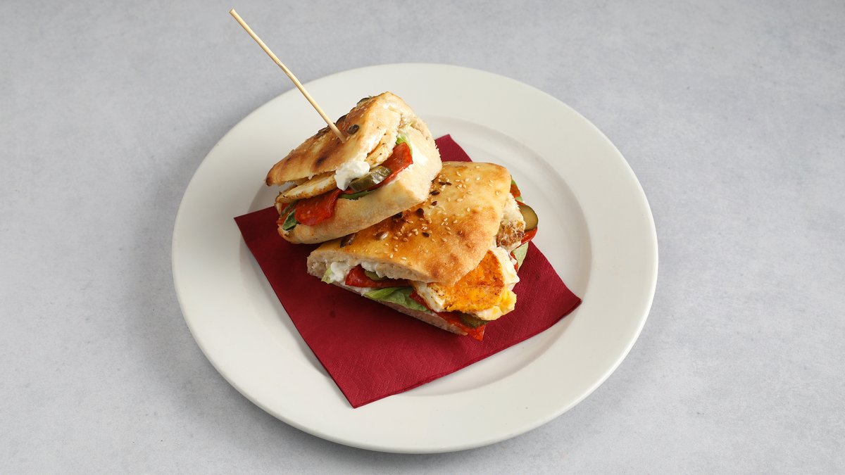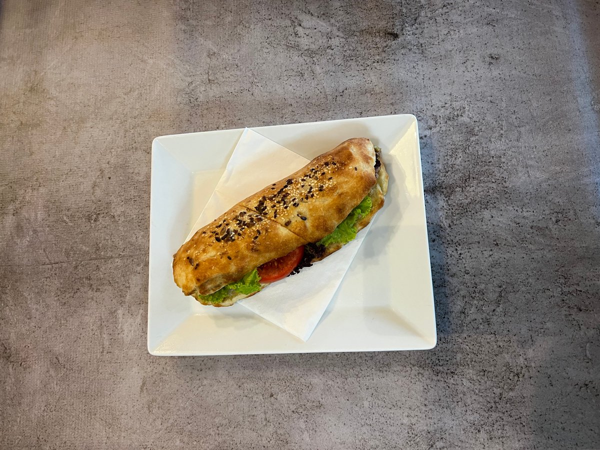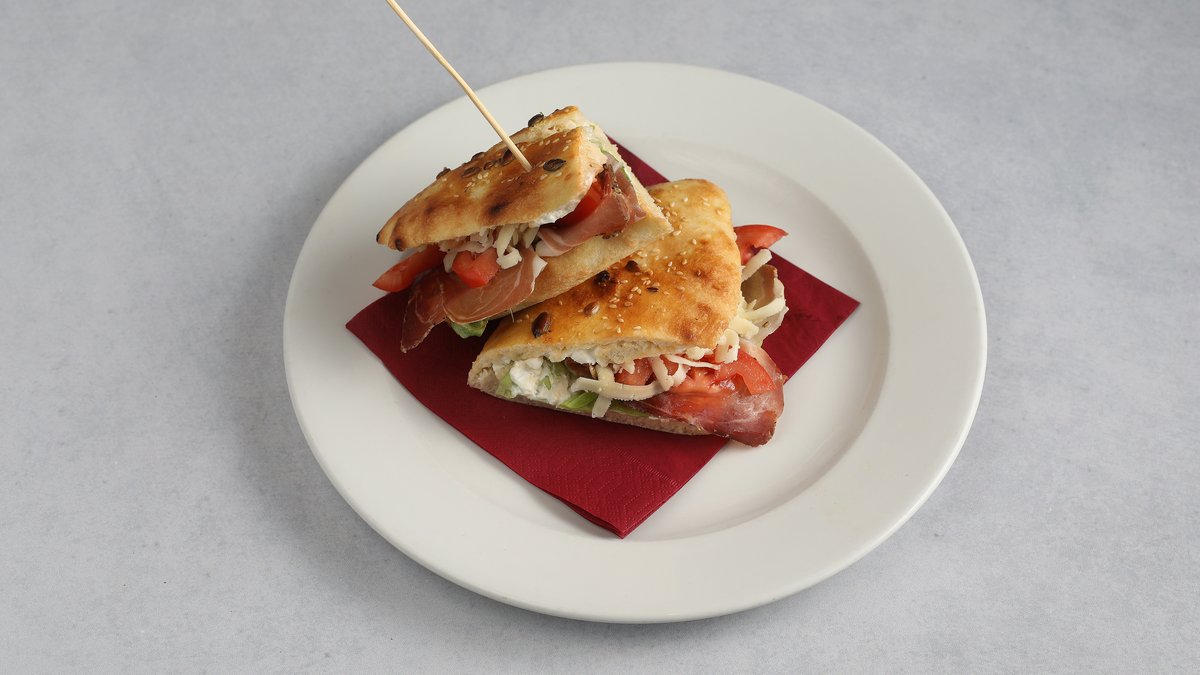 Ukusan sendvič s pršutom, slojevima krem sira, hrskave iceberg salate, kačkavalja, svežeg paradajza i maslina.