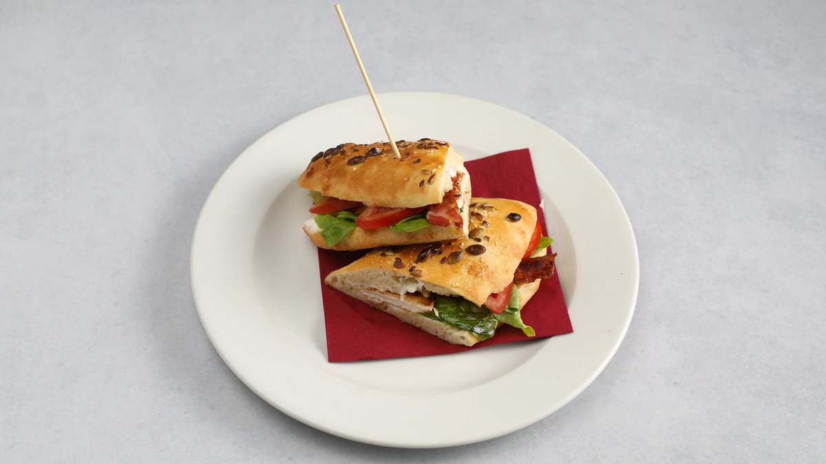 Uživajte u sočnom pilećem sendviču s cezar dresingom, svežom iceberg salatom, fileom pilećeg mesa, hrskavom pančetom, zrelim paradajzom i maslinama.