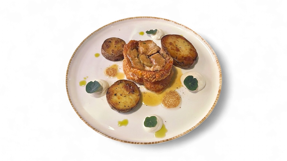pečenje od rolovane prasetine, domaći aromatizovan krompir, sezonsko povrće, mesni sos, mus od rena