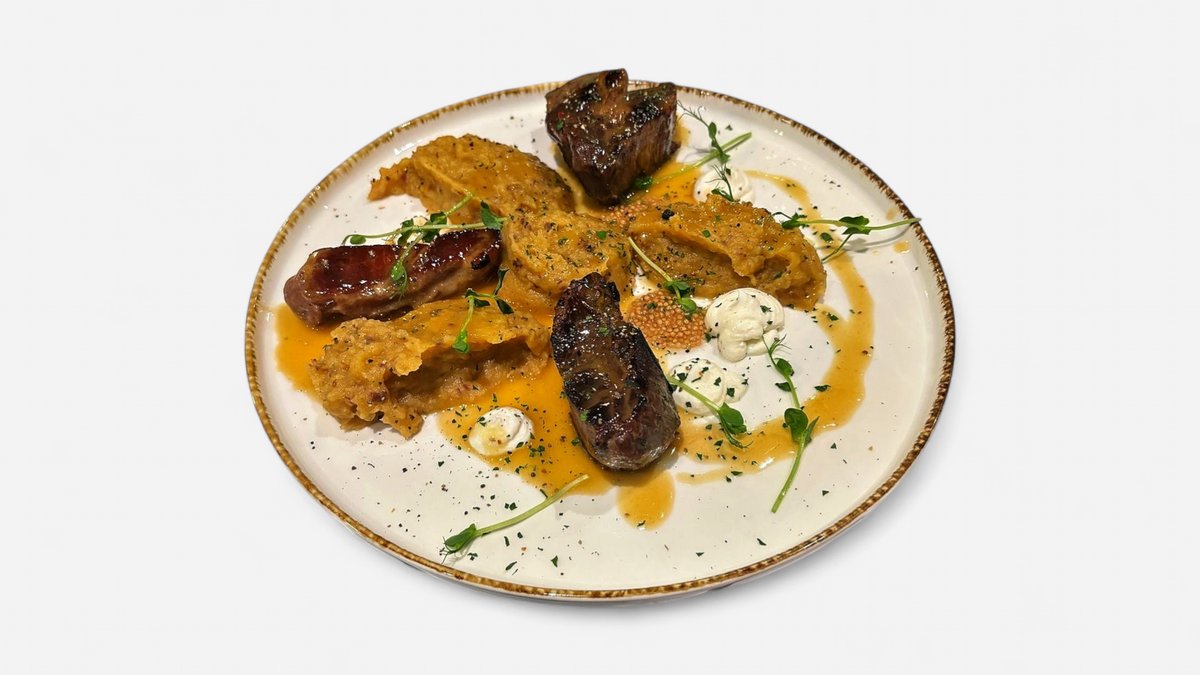 sporo kuvani svinjski vrat (16 sati), restlovan krompir, sezonsko povrće, mesni sos, mus od rena