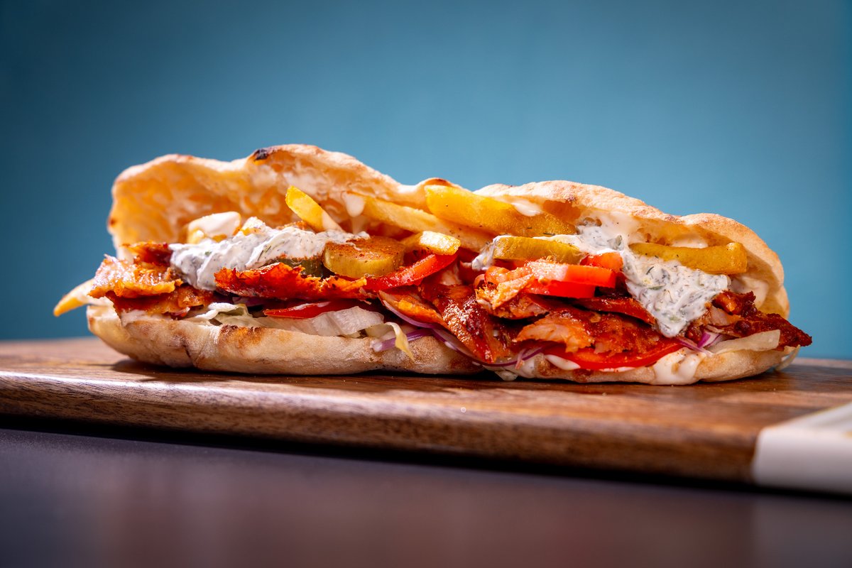 Pileci giros,pomfrit,giros sos,tzatziki,paradajz,crveni luk,ajzberg ,u somunu