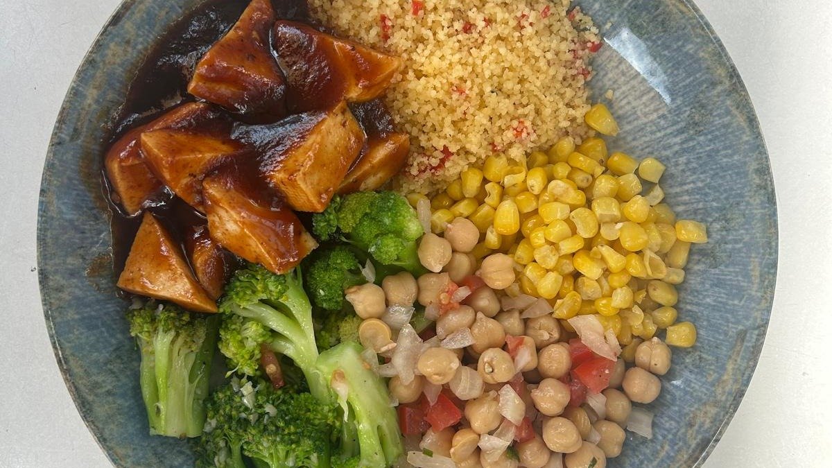 Tofu sa bbq sosom, kus kus, brokoli, leblebije, kukuruz šećerac