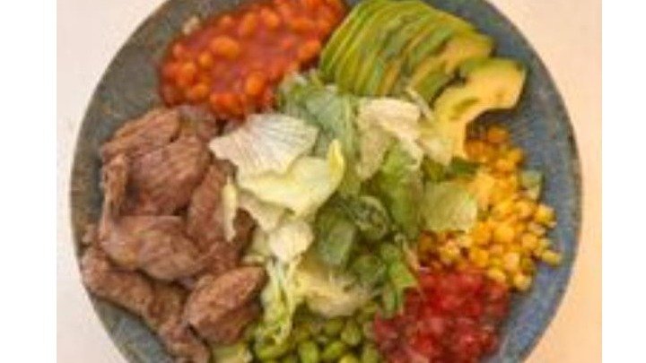 Grilovani biftek, avokado, mix zelenih salata, edamame, kukuruz šećerac, pasulj sa paradajz sosom, paradajz salsa.