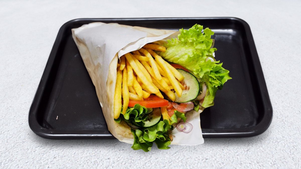 Gyros meso (150g), domaća gyros pita, pomfrit i prilozi po želji