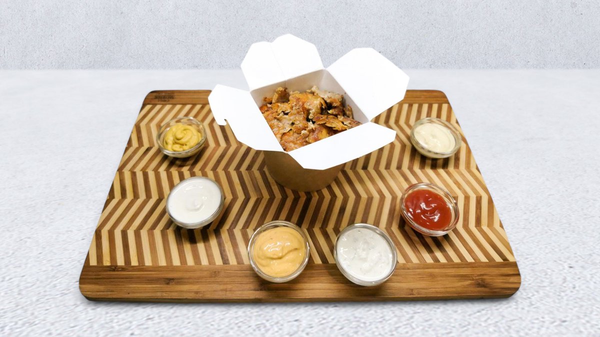 Gyros meso (200g), domaća gyros pita, pomfrit i prilozi po želji