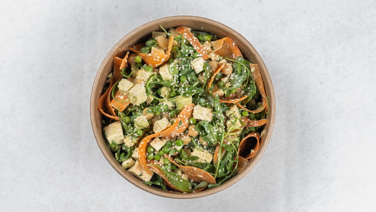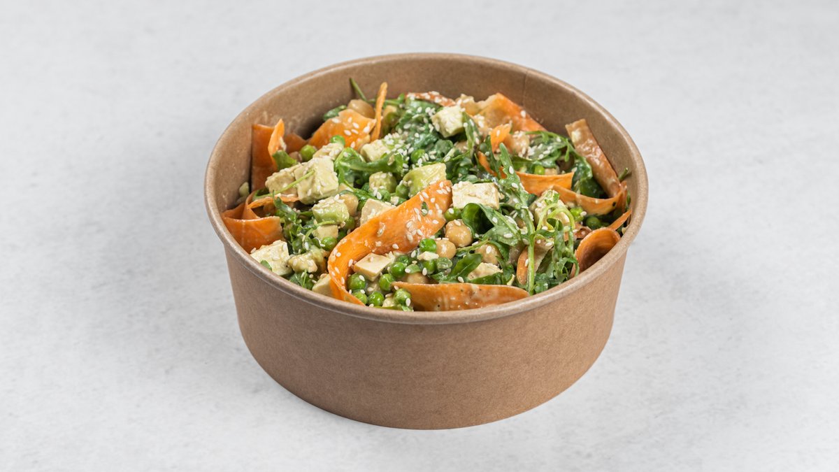 Standardna receptura (promenljivo po izboru): tofu, leblebije, šargarepa, avokado, rukola, grašak, tahini, susam Kcal: 422.7 | M: 22.8g | UH: 36.4g | P: 18.9g