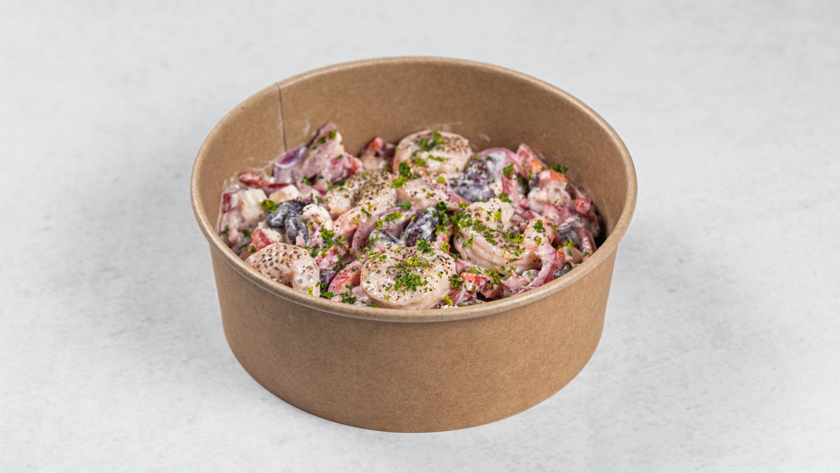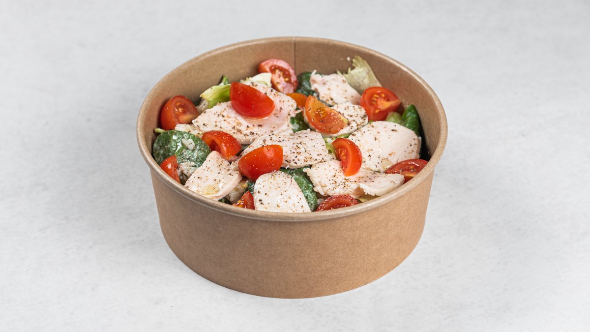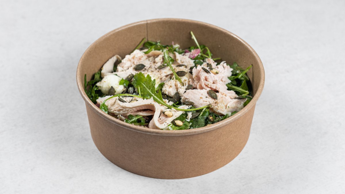 Standardna receptura (promenljivo po izboru): pileći file, kus-kus, čeri paradajz, marinirani luk, mini mocarela, masline bez koštica, rukola, maslinovo ulje, sok od limuna, semenke bundeve, origano Kcal: 678 | M: 41.6g | UH: 35.4g | P: 45.5g