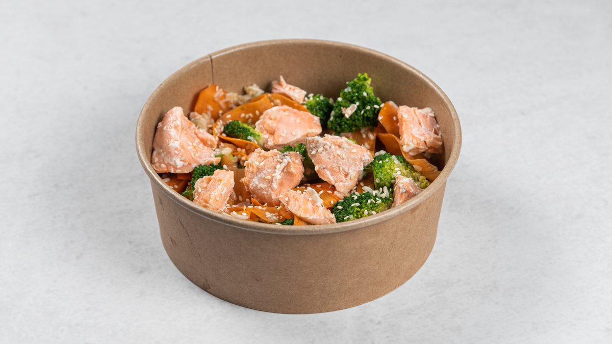 Standardna receptura (promenljivo po izboru): losos sous-vide, pirinač, brokoli, šargarepa, edamame, ponzu sos, susam, maslinovo ulje Kcal: 689.8 | M: 34.4g | UH: 61g | P: 37.7g
