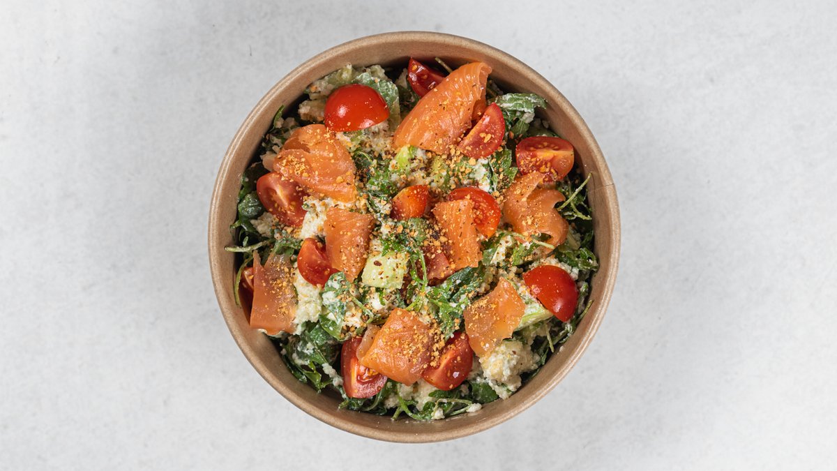 Standardna receptura (promenljivo po izboru): usoljeni losos, kus-kus, avokado, feta sir, čeri paradajz, krastavac, rukola, pečeni bademi, maslinovo ulje, sok od limuna Kcal: 530.6 | M: 33.7g | UH: 32.3g | P: 23.1g