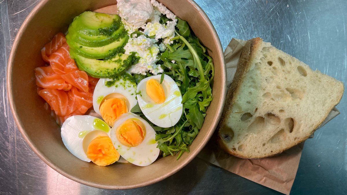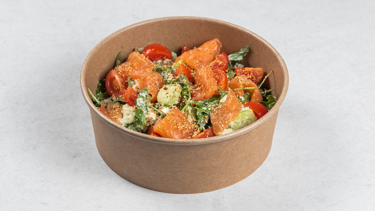 Standardna receptura (podlozno promeni): usoljeni losos, kus-kus, avokado, feta sir, čeri paradajz, krastavac, rukola, pečeni bademi, maslinovo ulje, sok od limuna Kcal: 721.8 | M: 48.2g | UH: 34.9g | P: 36.2g