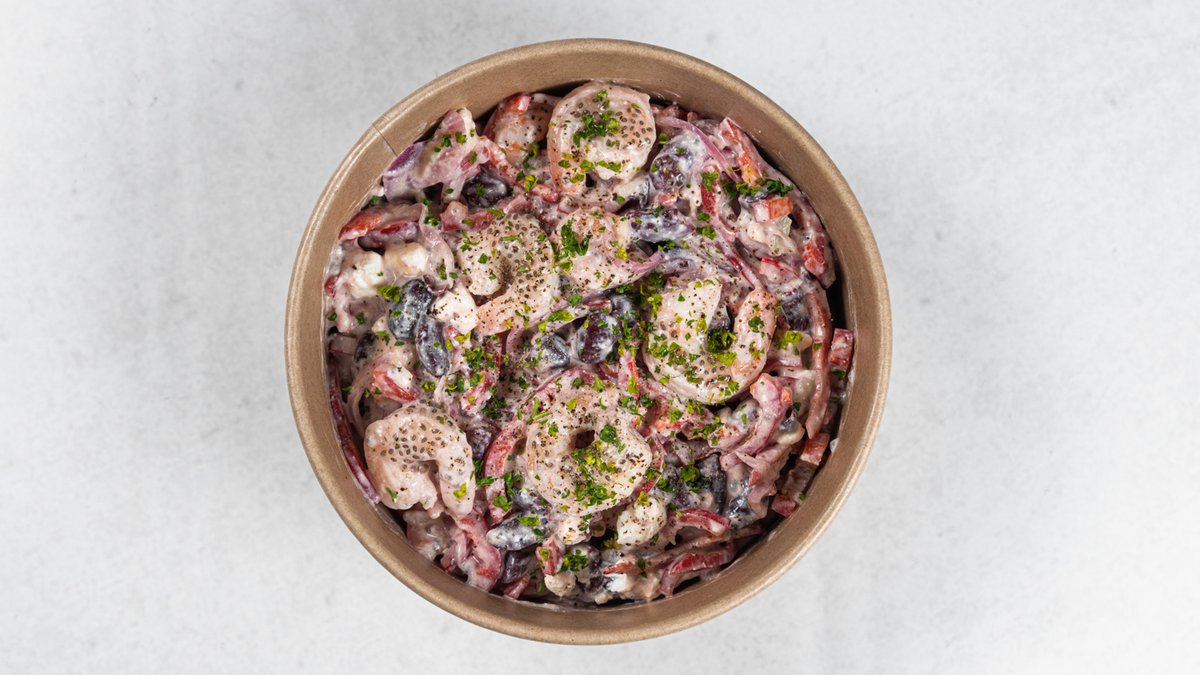 Standardna receptura (promenljivo po izboru): gambori, crveni pasulj, paprika, marinirani crveni luk, peršun, feta sir, caciki sos i čia semenke Kcal: 617.8 | M: 29.1g | UH: 39.1g | P: 48.3g