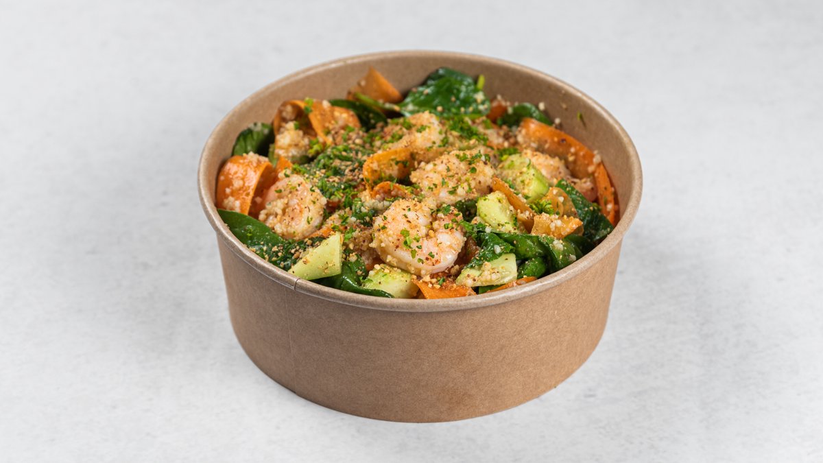 Standardna receptura (promenljivo po izboru): gambori, kus-kus, spanać, krastavac, šargarepa, peršun, ponzu sos, pečeni bademi Kcal: 422 | M: 9.4g | UH: 49.1g | P: 41.1g