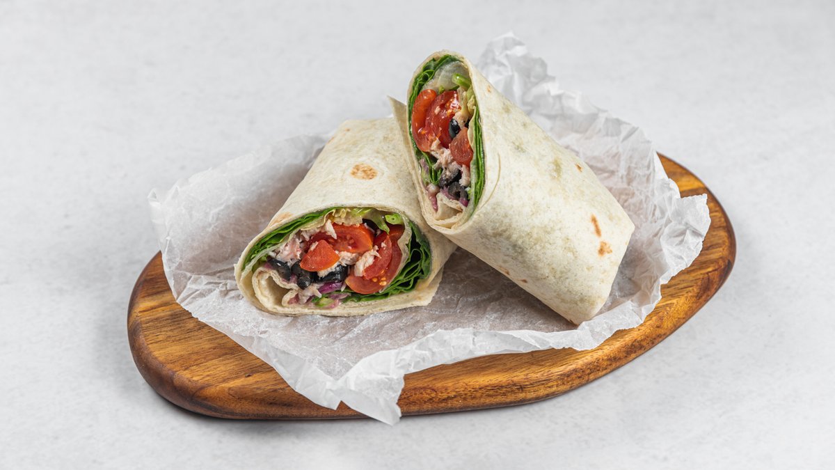 Pšenična tortilja, pileći file, mešana salata, čeri paradajz, marinirani luk, masline, med-senf sos Kcal: 544.6 | M: 13.5g | UH: 75.9g | P: 25.2g