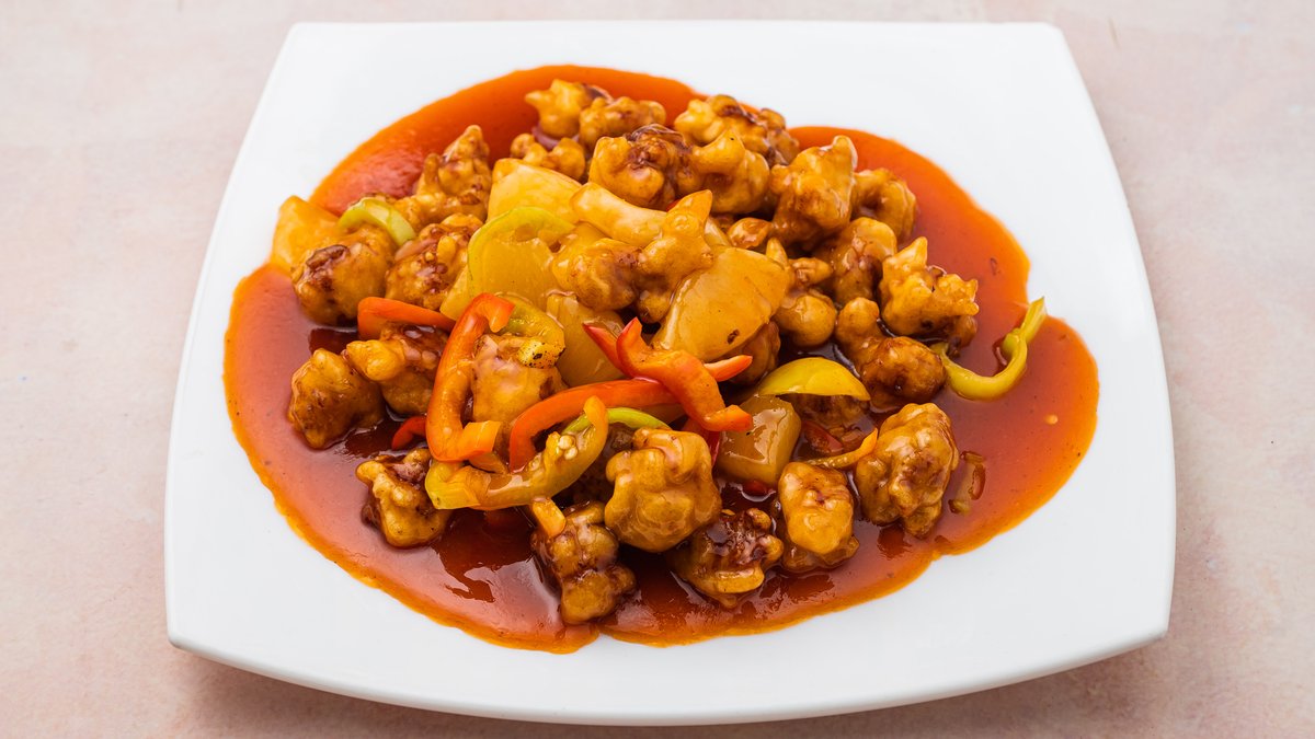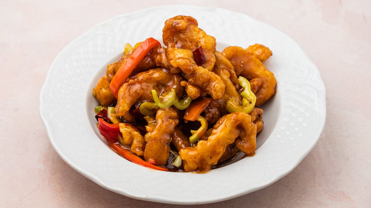 Hrskava svinjetina, ananas, zelena paprika, crvena paprika, med, sirće, paradajz sos, pirinač