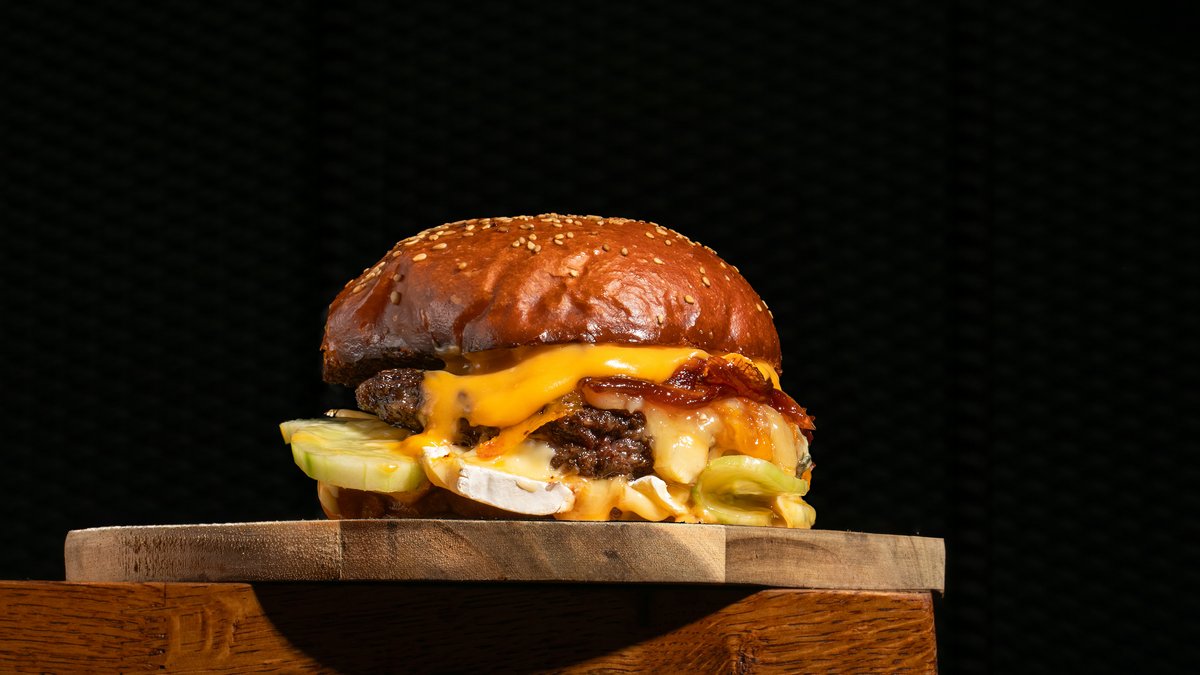 бриош, Beyond Meat пљескавица, чедар сир, камамбер сир, дорблу сир, сирни сос, краставац, лук џем \ brioche, beyond meat patty, cheddar cheese, camembert cheese, dorblue cheese, cheesy sauce, cucumber, onion jam