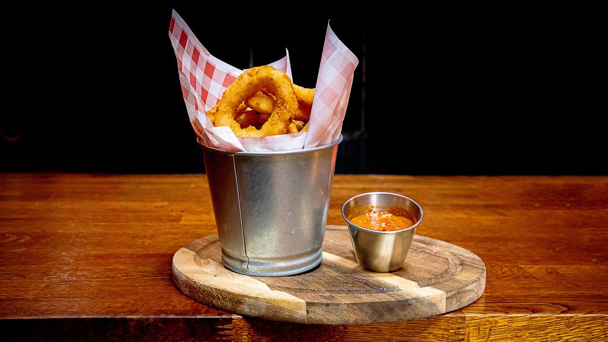 Briosh, goveđi pljeskavica, slanina, kiseli krastavac, crveni luk, džem od luka, BBQ sos, pečeni beli luk aioli sos \ Brioche, beef patty, bacon, pickled cucumber, red onion, onion jam, BBQ sauce, baked garlic aioli sauce