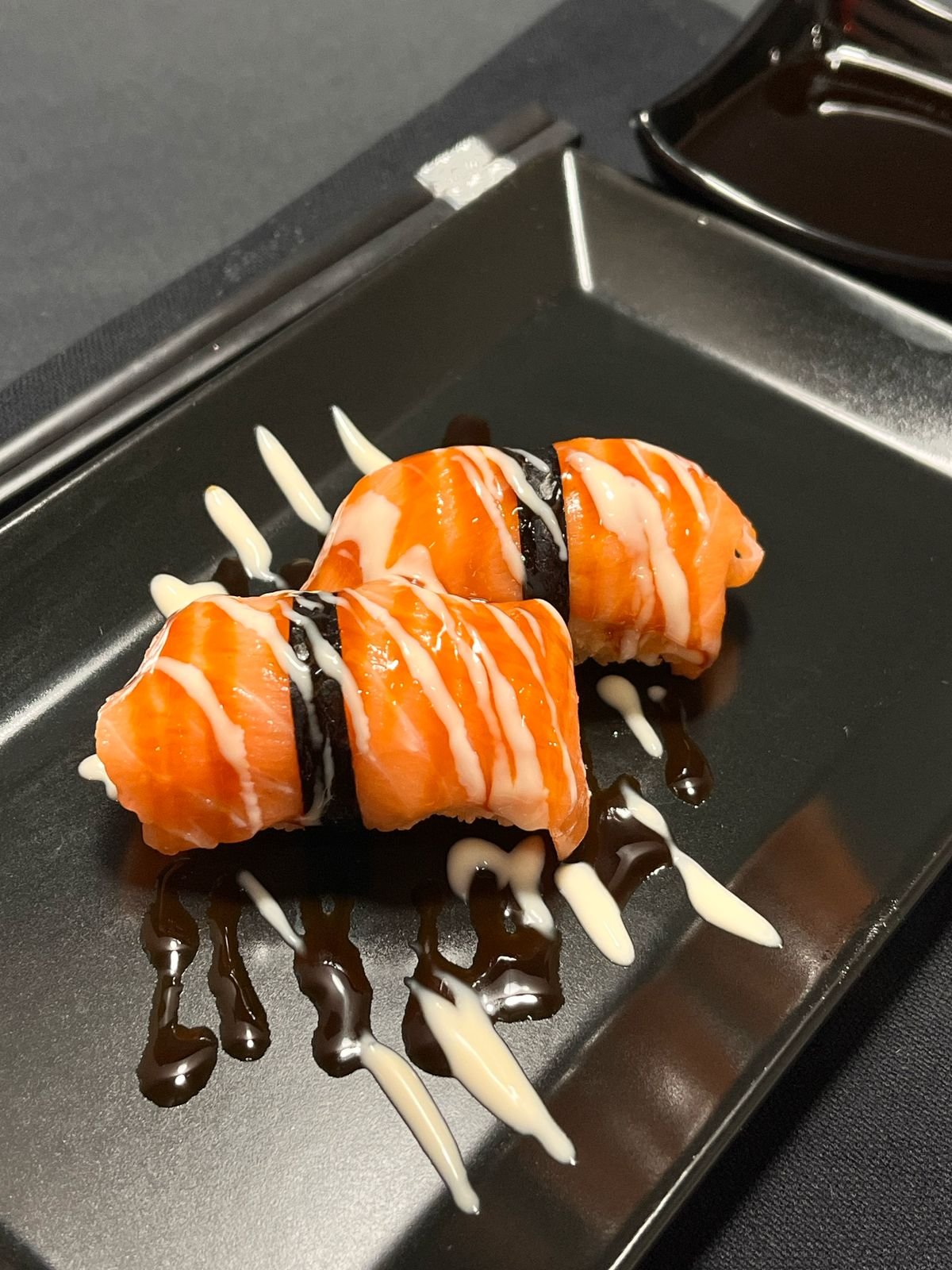 Nori, rice, fried salmon,cheese, cucumber, teriyaki