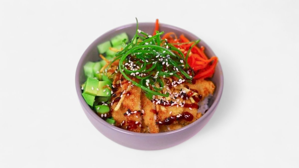 Pirinač, piletina u testu (tempura), šargarepa salata, krastavac, avokado.