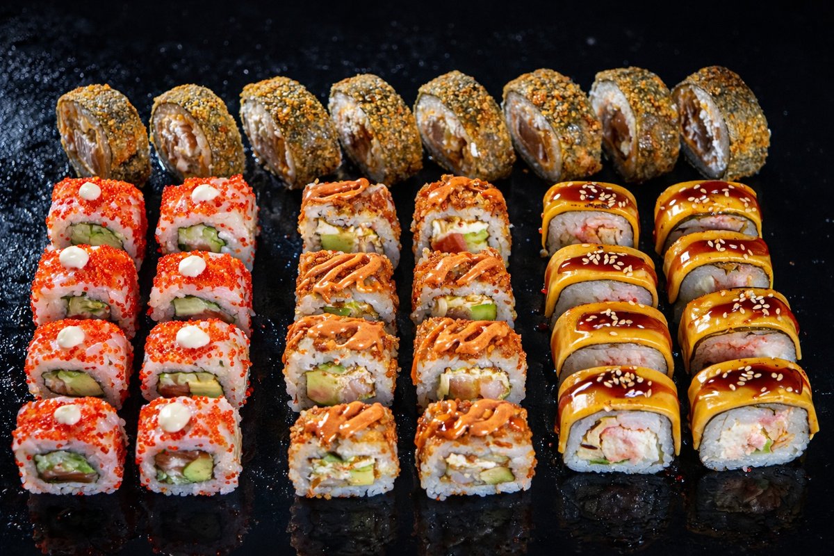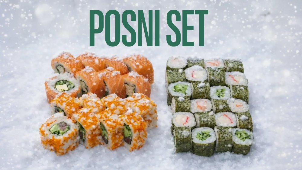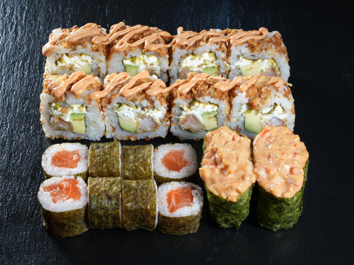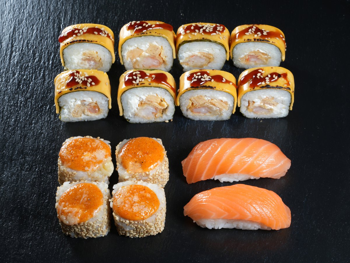 Filadelfija original 8 kom, California classic 8 kom, cezar 8 kom, Madagaskar 8 kom, klasik tempura 8 kom, crunchy rolls 8 kom