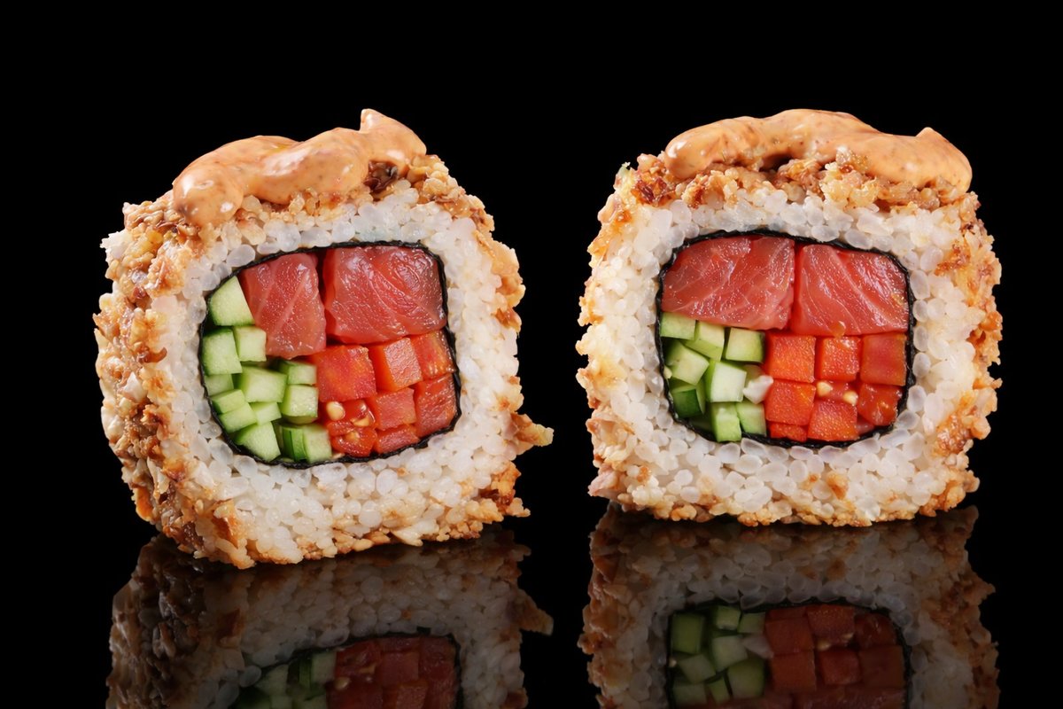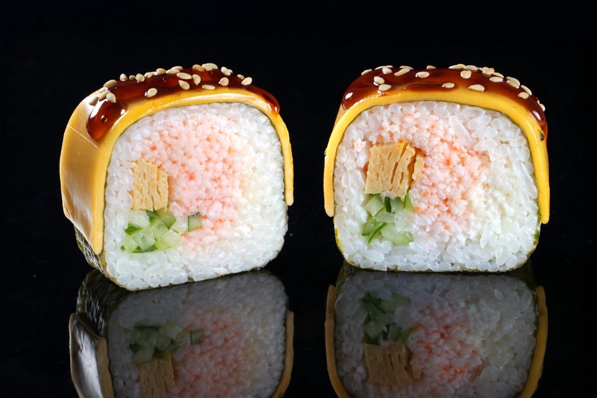 Filadelfija sir, paradajz, krastavac, snežna kraba, xo hot sos, unagi, susam