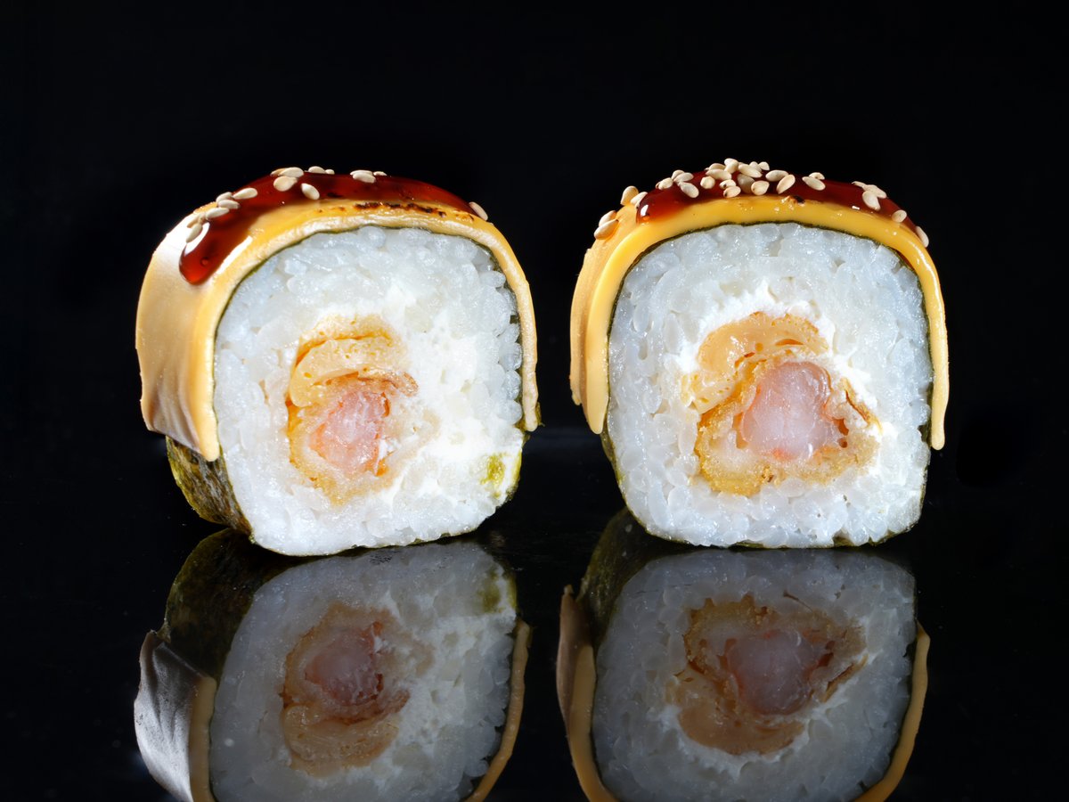 Škampi, losos, filadelfija sir, unagi sos, beli susam, 8 komada