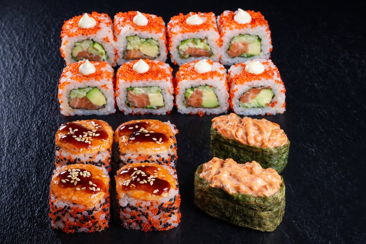 Losos, avokado, krastavac, japanski majonez, tobiko kavijar. 8 kom.