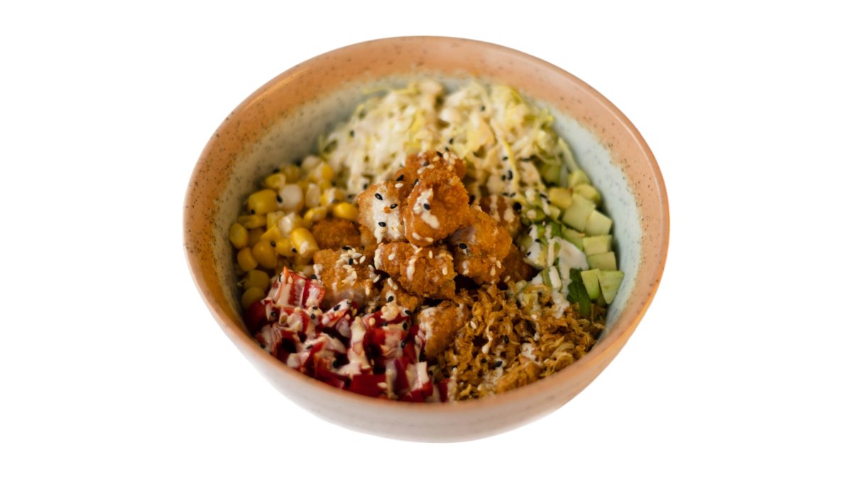 Pirinac, piletina, avokado, iceberg, kukuruz, paprika, hrskavi luk, BBQ mayo