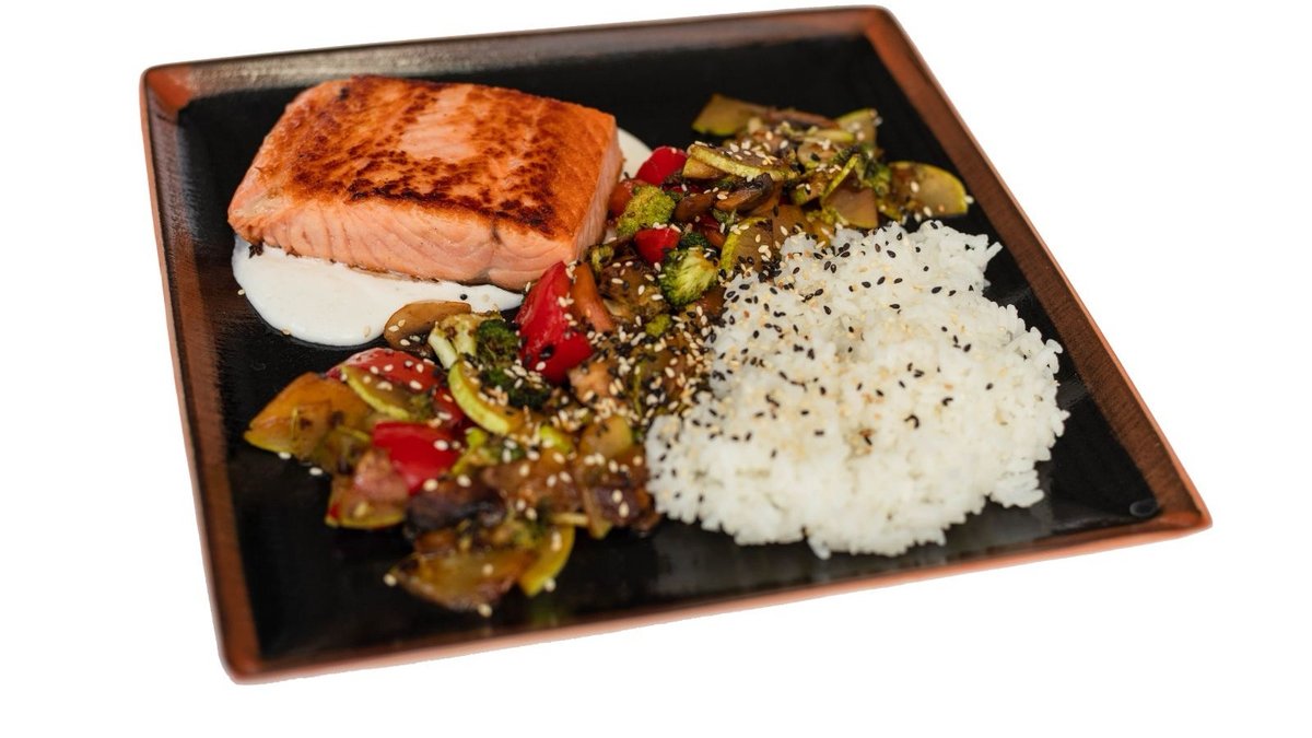 Stek losos na sosu od rena, grilovano povrce,pirinac 200g