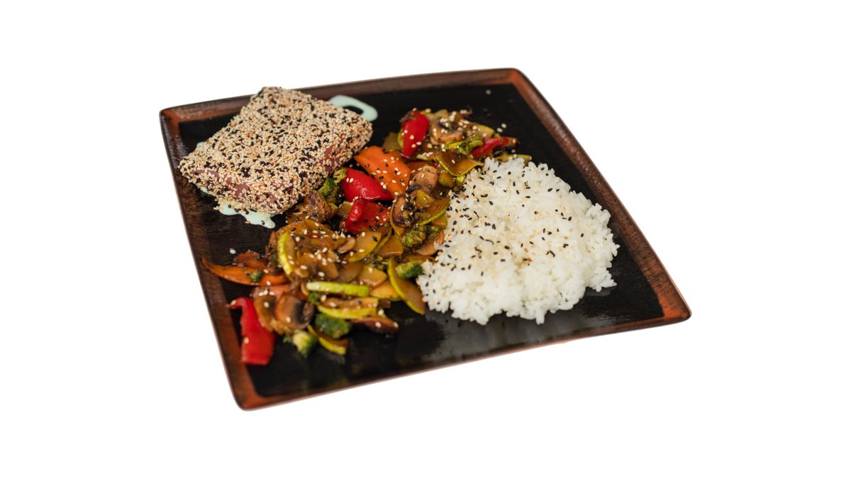 Stek tune u susamu na wasabi kremi, grilovano povrce, pirinac, 200g