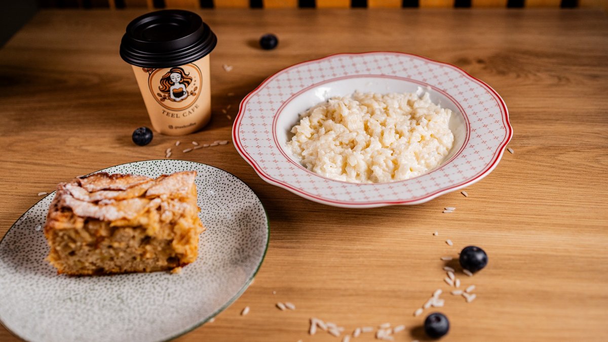 Doručak: Pirincana kaša + Cappuccino M+ Sharlotka / 2 Oreški