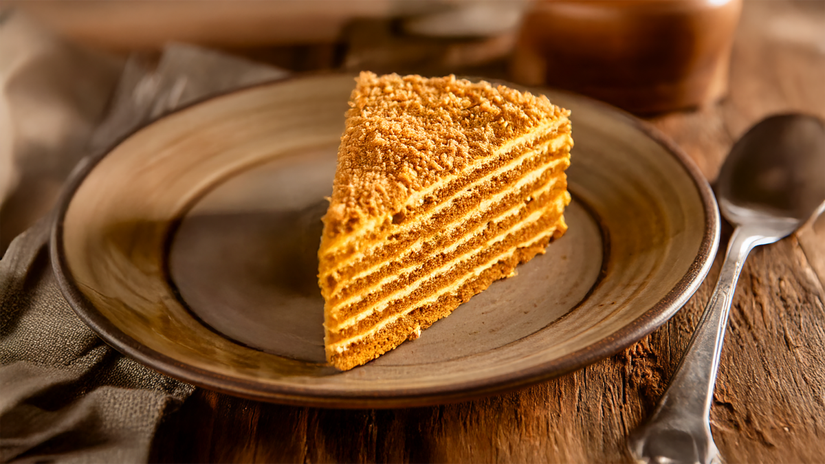 Klasična ruska torta sa medenim korama i laganom kremom. / Классический медовик с мёдовой основой и лёгким кремом.