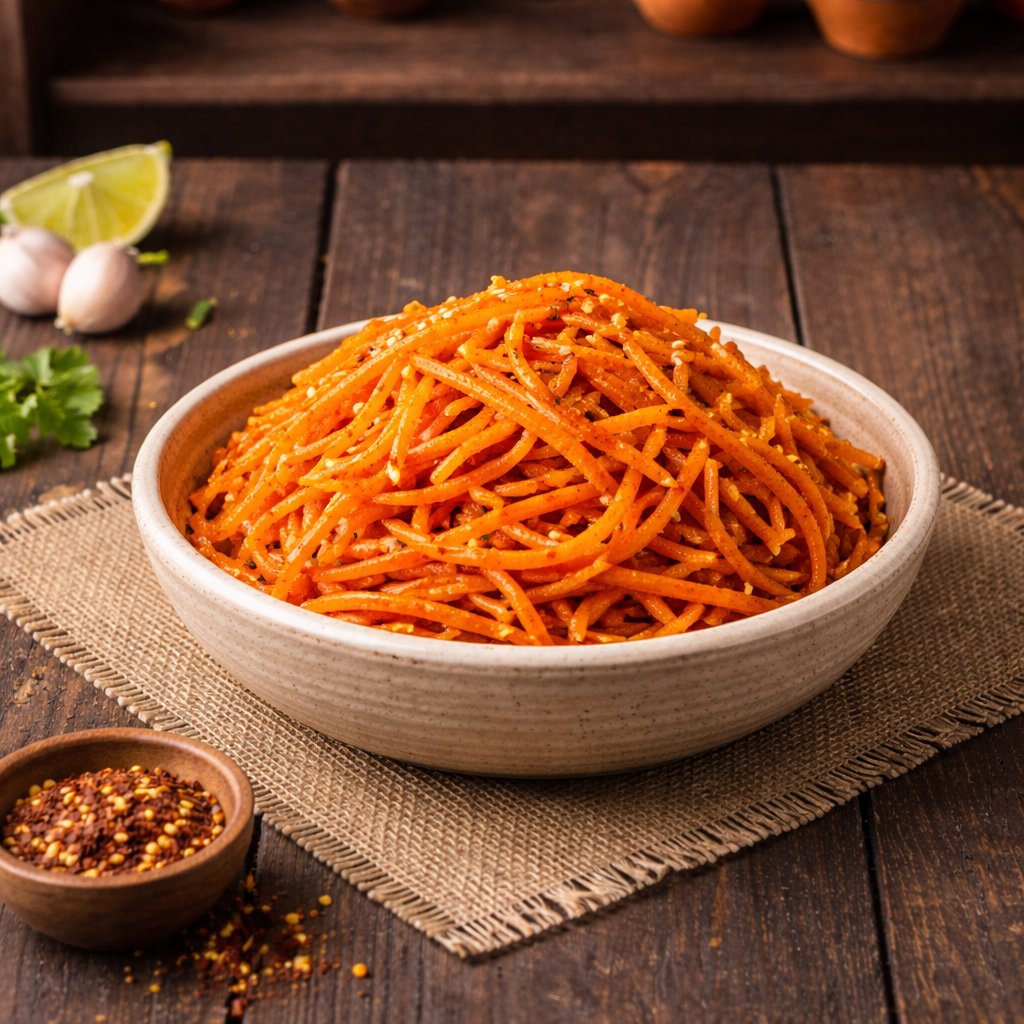 Sveža rendana šargarepa u poznatoj korejskoj pikantnoj marinadi — Свежая тёртая морковь в классической корейской пикантной маринаде