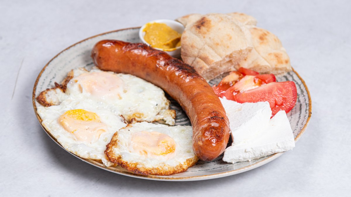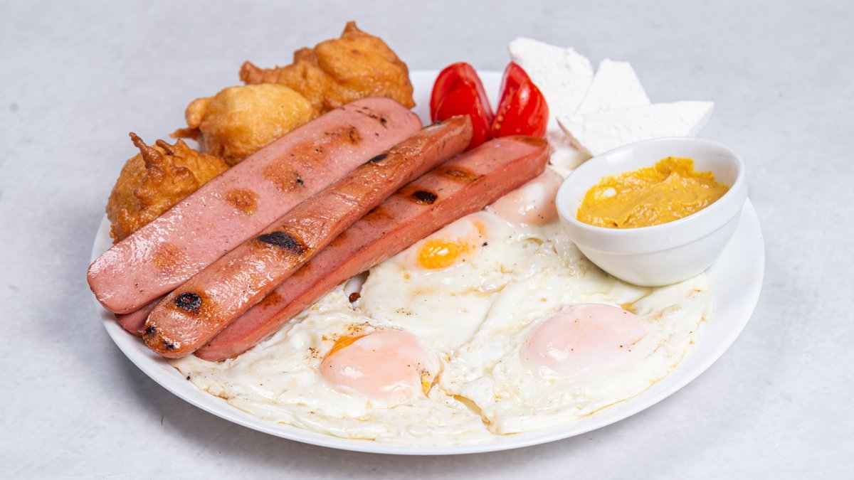 3 jaja, dimljena roštilj kobasica, sir, paradajz, senf, uštipci