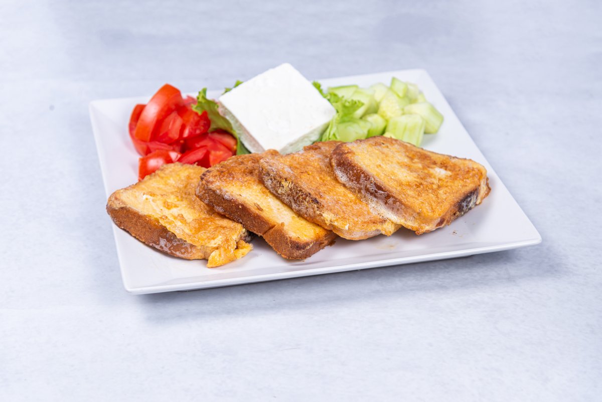 3 tosta pohovana u 3 jaja, pavlaka, ajvar, čedar, kačkavalj, pečenica i šunka