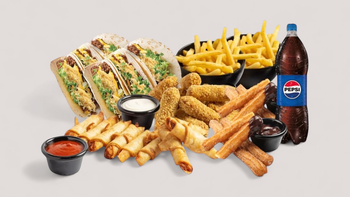 Crispy Chicken 10kom, Taqutios 9kom, 2 porcije churrosa+ 2 umaka, 2 porcije soft tacosa (junetina+ piletina), 2 porcije pomfrita, Pepsi 1,5l