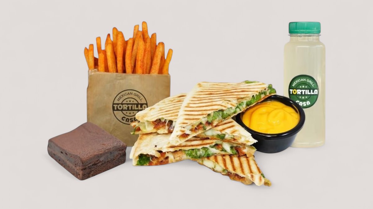 Quesadilla piletina+ sos, soft tacos (piletina), porcija pomfrita, 2 limunade