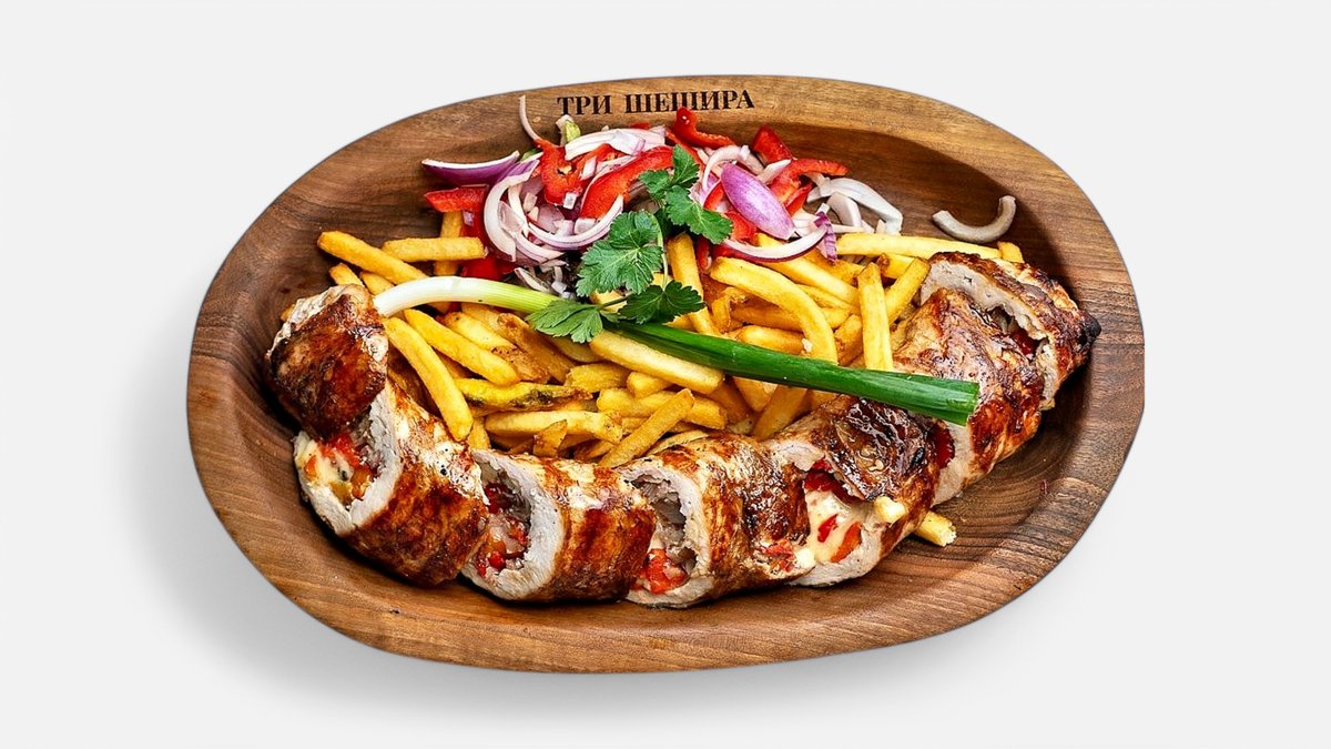 Pljeskavica punjena goveđom pršutom i kačkavaljem sa šeširom od piletine na kajmaku