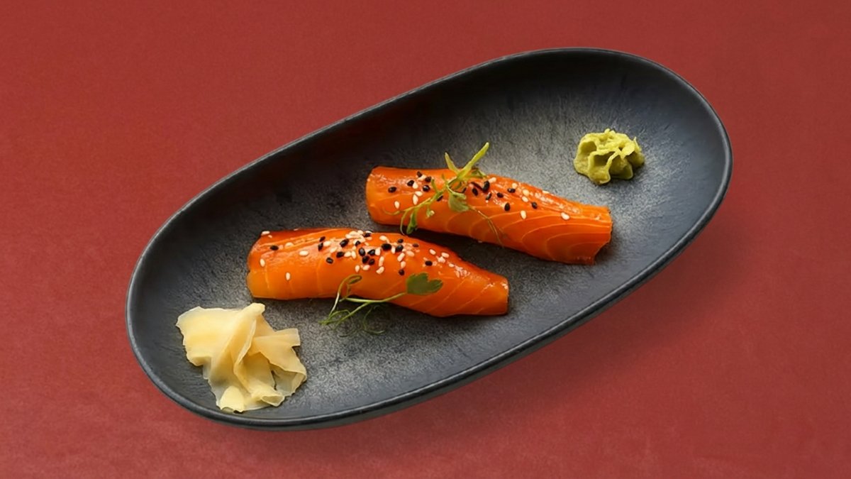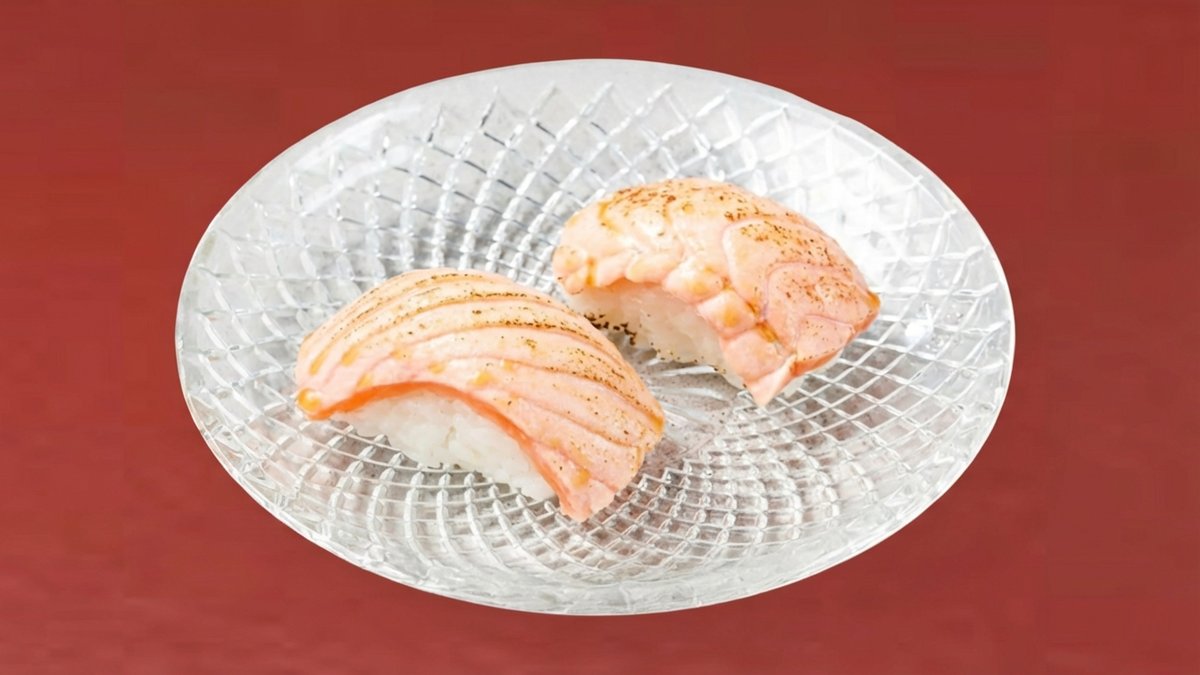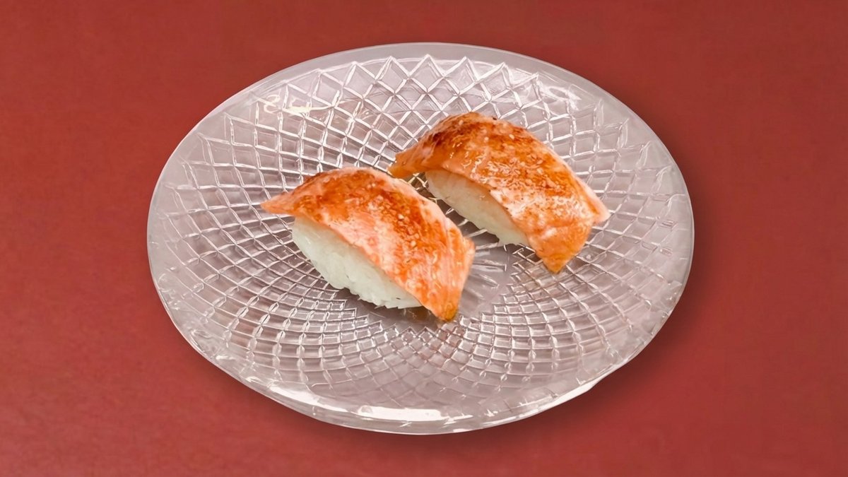 Gently torched salmon nigiri with a rich, delicate flavor.