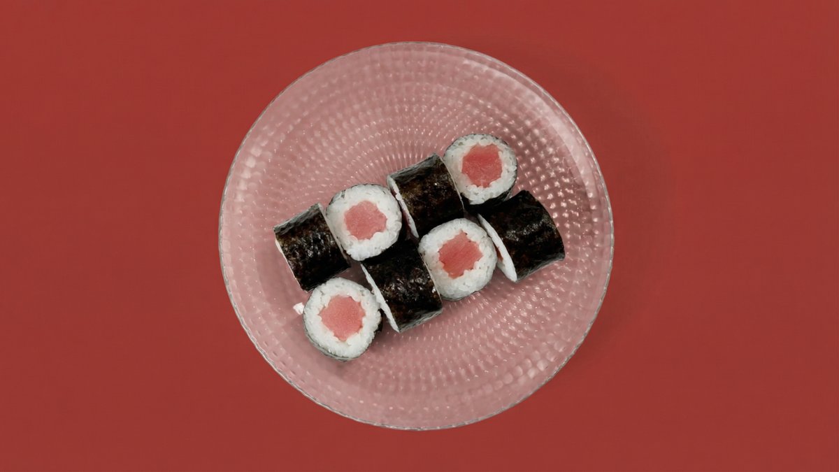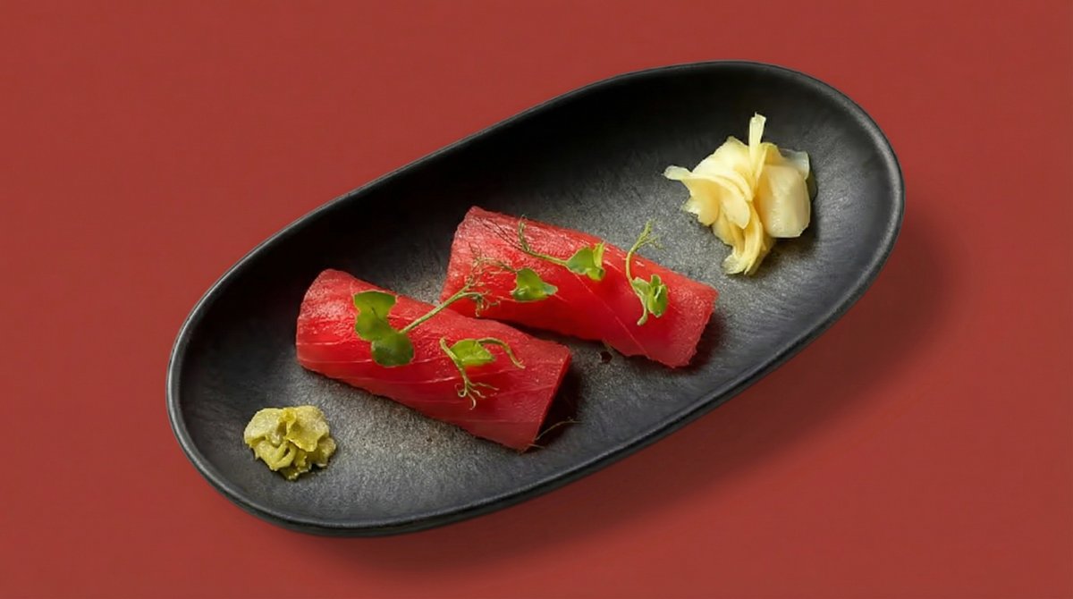 Classic nigiri sushi with fresh tuna over seasoned rice.